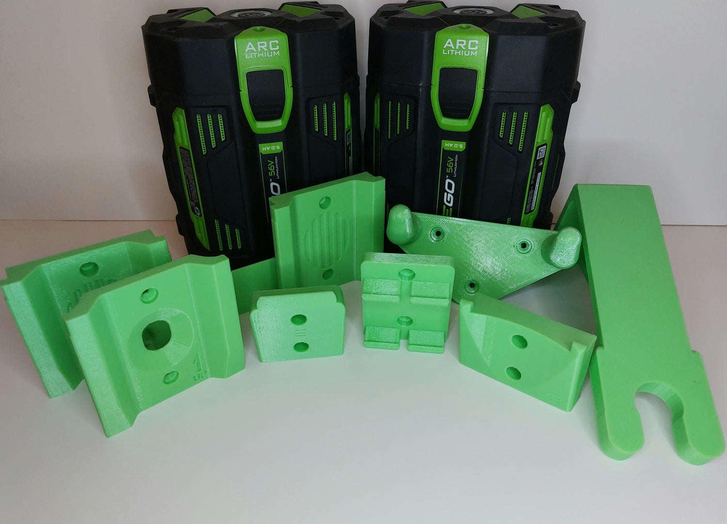 This trimmer rack is 3D printed (FDM) using durable PET-G (polyethylene terephthalate glycol, a.k.a. polyester).